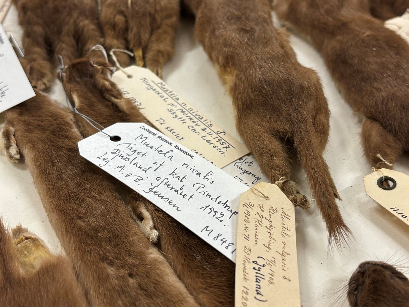 I de videnskabelige samlinger på Statens Naturhistoriske Museum i København, hvor dette billede er taget, findes en række eksemplarer af brud. De er indsamlet over mange år, og fra flere lokaliteter. Al information om eksemplarerne er noteret, så forskere kan bruge den viden i dag, når de fx indsamler DNA fra hår- eller vævsprøver. Foto: Emma Emilie Andersen.