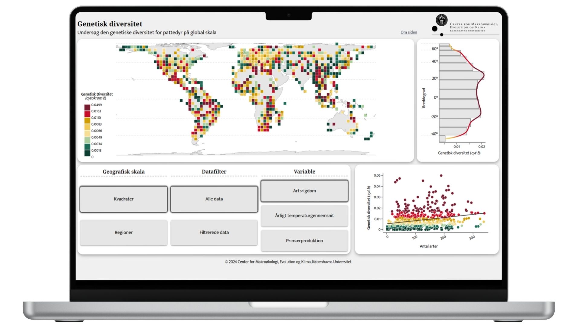 BIG DATASom en del af dette undervisningsforløb om genetisk diversitet har du mulighed for at tilgå et enormt, globalt datasæt om genetisk diversitet for landlevende pattedyr på Jorden. Datasættet kommer direkte fra biodiversitetsforskningen, og det kan undersøges interaktivt vha. et digitalt dataværktøj.