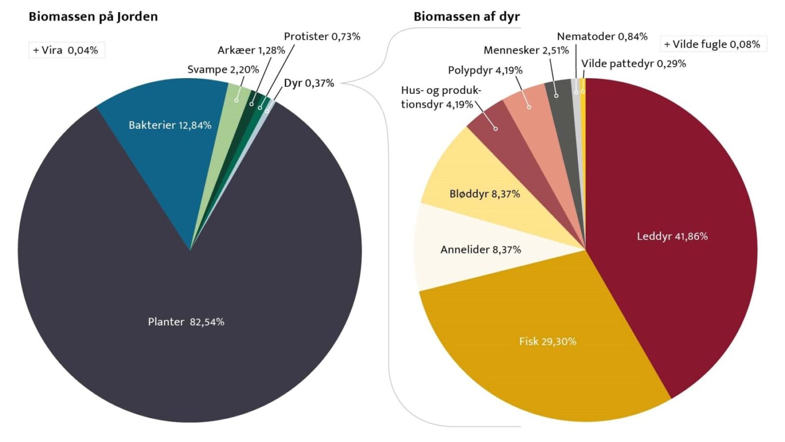 Figur 7. Fordelingen af Jordens biomasse i procent, til venstre fordelt på de biologiske riger og til højre på dyreriget (biomassen af reptiler og padder er så lille, at den er udeladt). Data om biomassen på Jorden er målt som gigatons kulstof (carbon), og forskere er nået frem til disse resultater ved at tage stikprøver af de forskellige organismers biomasse rundt omkring på Jorden og derefter gange den målte biomasse med antallet af steder på Jorden, hvor man forventer at finde netop de organismer. Data fra artiklen ”The biomass distribution on Earth” af Bar-On m.fl. (PNAS, 2018).