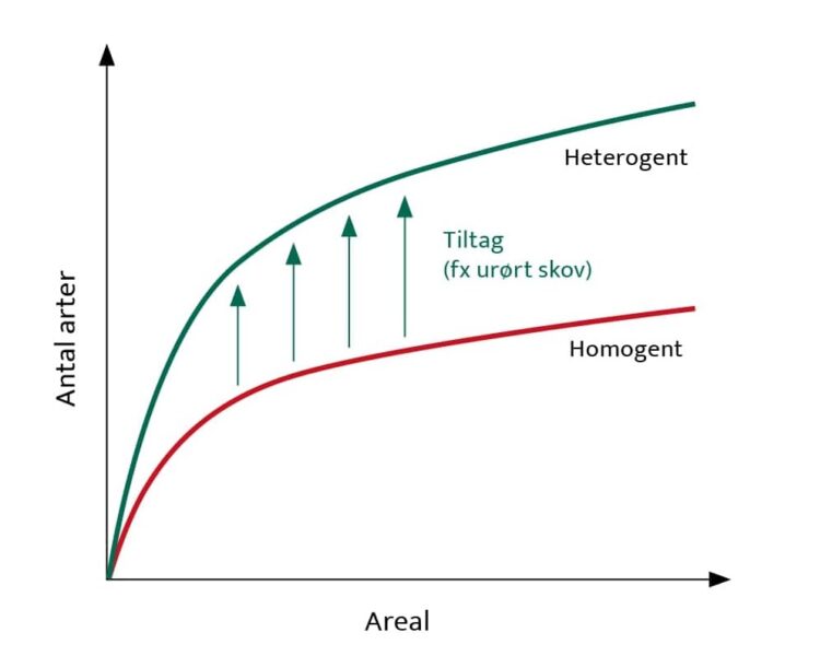 Figur 5. Habitat-heterogenitetssammenhængen fortæller os, at jo mere heterogent et habitat er (altså jo højere habitatdiversiteten er i et område), jo flere arter kan der findes i området. Arts-arealsammenhængen vil derfor placere sig højere oppe ad y-aksen, hvis habitatet er mere heterogent, fx hvis man har omdannet et skovområde fra dyrket skov til urørt skov.