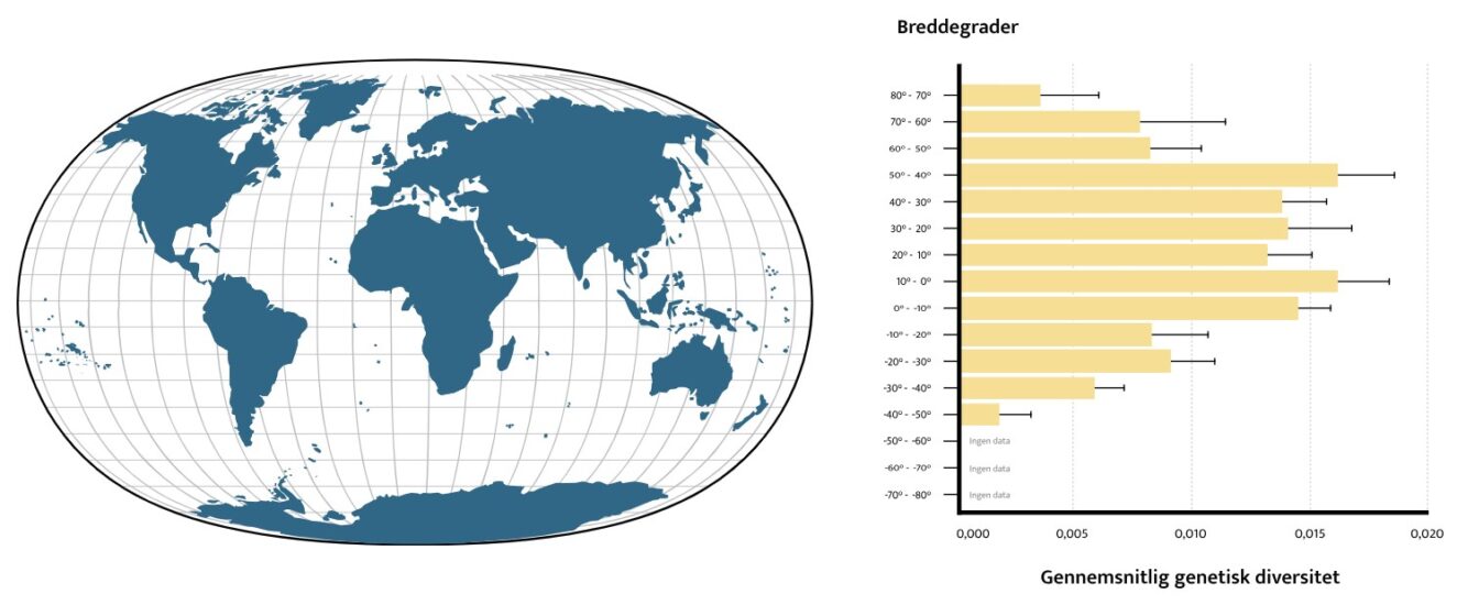 Figur 9. Genetisk diversitet er typisk højest omkring Ækvator. På søjlediagrammet til højre ses den intraspecifikke genetiske diversitet for pattedyr for genet, der koder for cytokrom b, der findes i mitokondrier. Data fra artiklen ”An Anthropocene map of genetic diversity” af Miraldo m.fl. (Science, 2016).